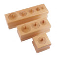 Set of 4 blocks with cylinders varying in height and/or diameter in each block. Made of solid hardwo