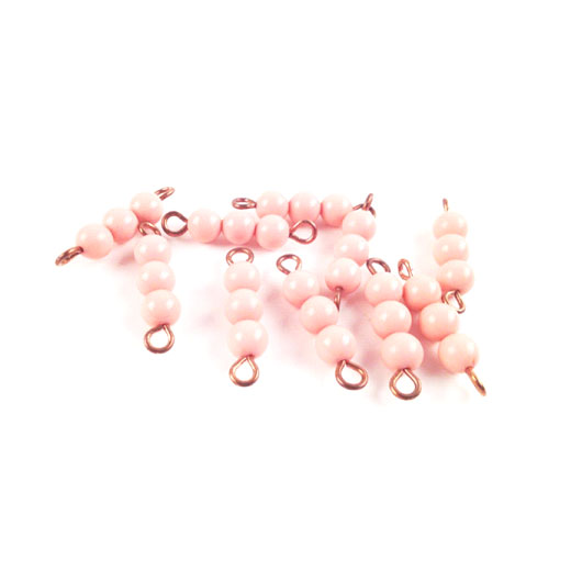 10 pink plastic bead bars of three. Used in a number of mathematical activities to help the child work out addition, subtraction, multiplication and division sums.