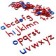 A set of thick wooden letters containing 5 of each letter in Blue and Red.