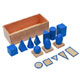 A large wooden box containing a cylinder cube ellipsoid cone sphere square-based pyramid triangular-based pyramid ovoid rectangular prism and triangular prism painted in Glossy blue. The box includes five wooden plane figures and three wooden stands for the curved solids.