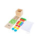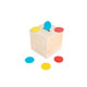 An open cube and 3 interchangeable wooden lids provide 3 wooden toys for children aged 1-3. The lid magnetically attaches to the cube, allowing kids to place wooden coins, grow and harvest wooden carrots, or sort wooden match pins by color.