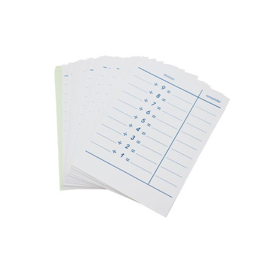 100 sheets of division tables for the numbers 1-81 for use with the Division Bead Board.