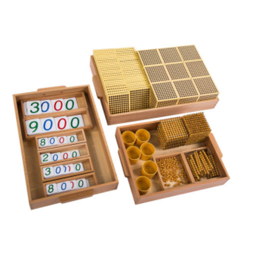 The Golden Bead Material introduces the child to the decimal system with concrete representations of the hierarchy of numbers. Quantity and place value is explored by the child through activities in the operations of addition, subtraction, multiplication and division.