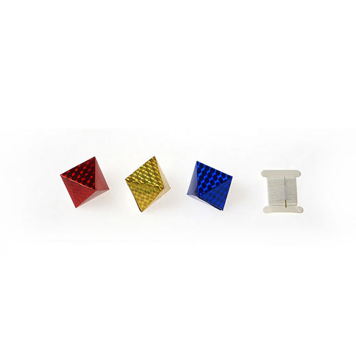 Octahedron,1 red, yellow and blue hexagonal objects, 2 acrylic rods, several white lines, 1 needle, 1 manual