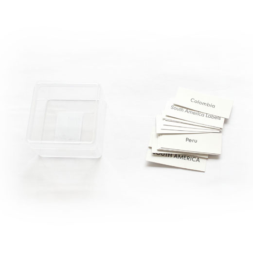 A set of labels printed with 12 countries names to be used with the Puzzle Map of South America. Transparent plastic container included