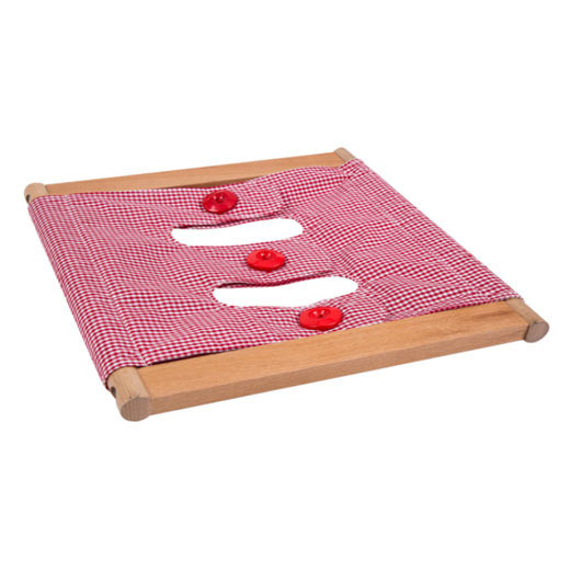 Dressing frame for infant and toddlers. Teaches how to use metal snaps buttons. Dimensions: 11 x 11.5 inches