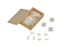 Wooden box with lid containing 5 sets of aritjmetic signs (+ - x : = < >, etc.) and numb...