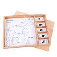 A wooden compartment box with lid containing 5 control cards and 25 name cards for animal puzzle ac